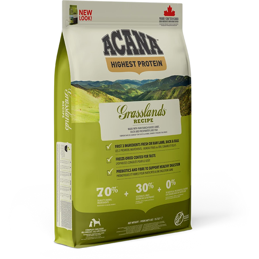 A dús fűvel borított legelők és az északi tavak inspirálták az ACANA Grasslands kifejlesztését. A fehérjék és zsírok széles választékát garantálja a bárány, a szabadon tartott kacsa, a mélyalmos tojás és a többféle vadon fogott édesvízi hal. A belsőségek, porcok, emészthető csontok és egészben megfőzött édesvízi halak biztosítják az EgészPréda arányait. A változatos állati fehérjeforrások lemásolják a kutyafélék természetes étrendjének összetettségét, hiszen egy ragadozó többféle prédával táplálkozott.