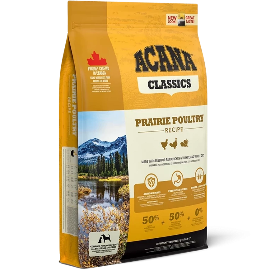 A modern kutyák nemcsak képesek megenni őseik táplálékát, hanem szükségük is van rá a kiváló egészségi állapot fenntartásához. Pontosan ezért készül az ACANA Prairie Poultry csirkéből, pulykából és baromfibelsőségekből. A baromfihúsok-és belsőségek naponta frissen vagy nyersen* érkeznek a környező farmokról. Az ACANA Prairie Poultry alacsony glikémiás zabot tartalmaz, ezért a vércukor szintje stabil marad, csökkentve az elhízás kockázatát.