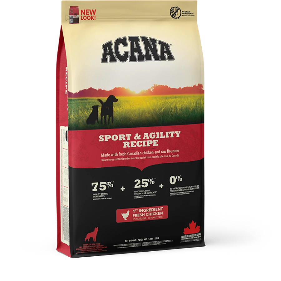 Fokozott fizikai igénybevétel során az állóképesség és az izomtömeg fenntartásához magas zsír-és bőséges fehérjetartalmú étrend szükséges. Ezért az ACANA Sport & Agility 75 % húsból készült: friss csirke, egész tojás és Csendes-óceánból fogott nyers lepényhal. A húsok és belsőségek naponta frissen vagy nyersen érkeznek, a WholePreyTM arányainak megfelelően. Az ACANA nem tartalmaz gabonákat vagy burgonyát, ellenben tele van teljes húsokkal, értékes fehérjékkel és zsírokkal, melyek tökéletesen illeszkedve a munkakutya extra igényeihez.