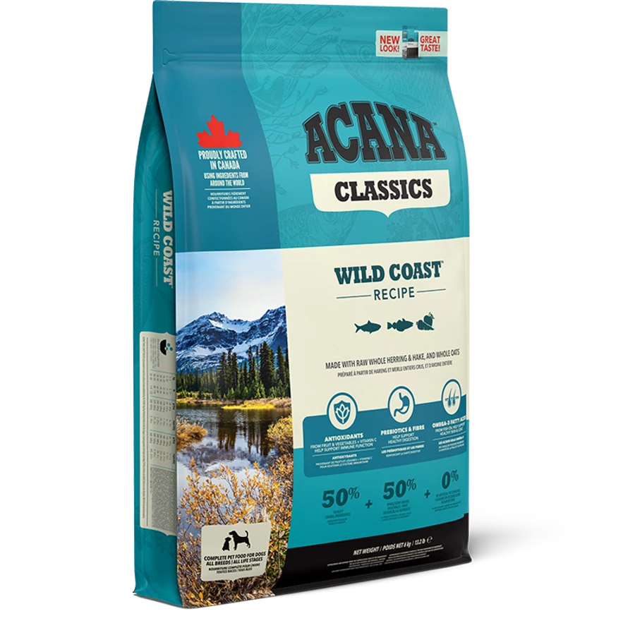 Az ACANA Wild Coast nyers lazacból* és dehidratált heringből készül, az ízletességét sertészsír teszi teljessé. A halas ACANA fő szénhidrátforrásai az alacsony glikémiás gyöngyárpa, borsó és zab; ezért a vércukorszint stabil marad, csökkentve az elhízás kockázatát. Semmi csirke vagy bármilyen baromfiszármazék, ezért allergiagyanú esetén eliminációs diétához is kiváló.