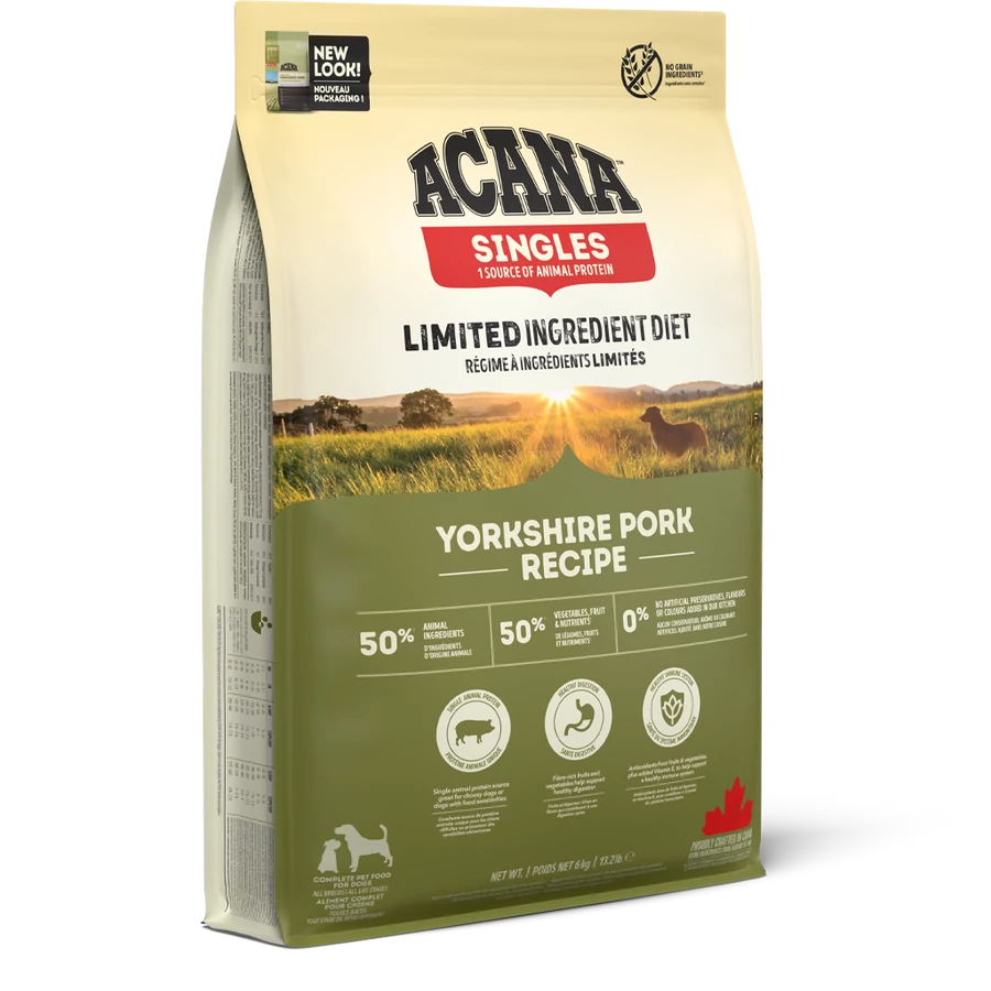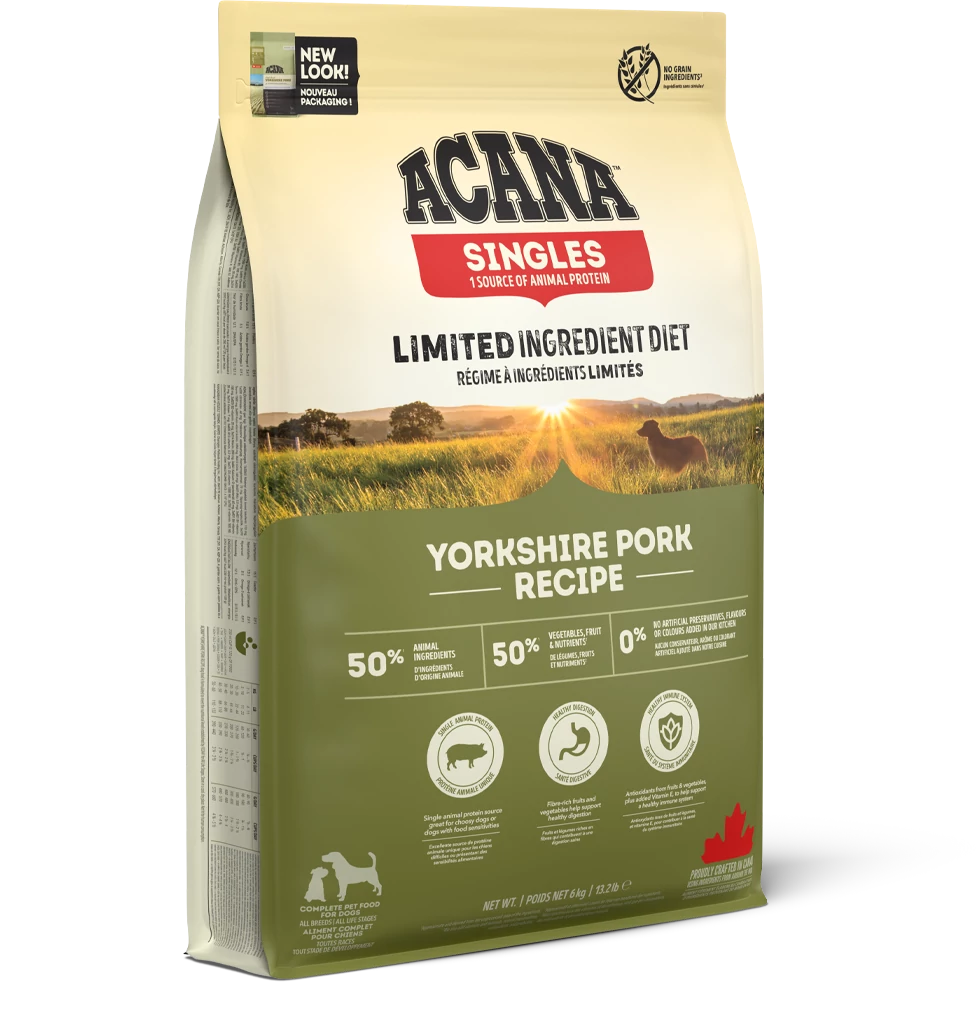 A korlátozott összetétel nem jelent kevesebb húst, az ACANA Yorkshire Pork 50 % sertésből készül. Az ízletes vörös hús a kizárólagos fehérjeforrás, ezért allergiagyanú esetén, eliminációs diétaként biztonságos választás. A Yorkshire sertés frissen vagy nyersen érkezik, és a WholePrey™ arányainak megfelelően a hús mellett belsőségeket és porcokat is tartalmaz. A friss spárgatök és pézsmatök bőségesek vízben oldható étrendi rostokban, melyek még az érzékeny emésztőrendszer működését is kedvezően befolyásolják.