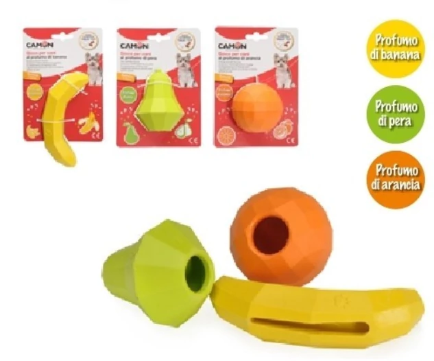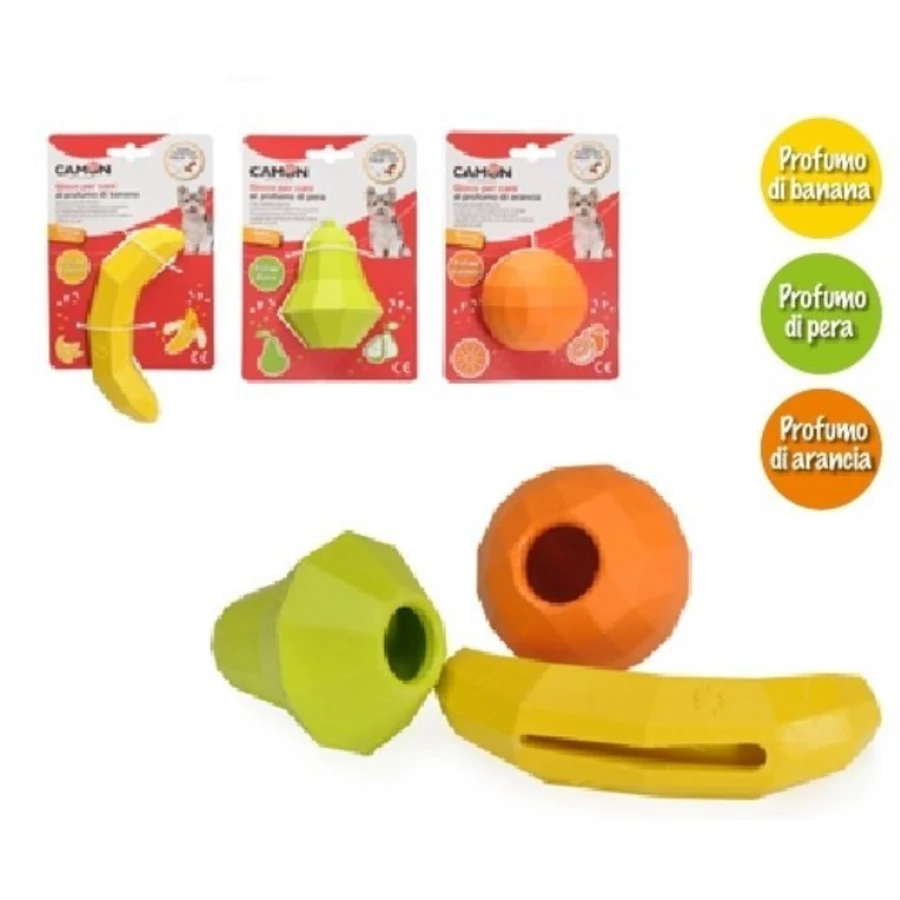 Erős gumiból készült gyümölcs ízű és formájú játék, melybe jutalomfalat rejthető. Kedvencünket interaktív játékra ösztönzi.