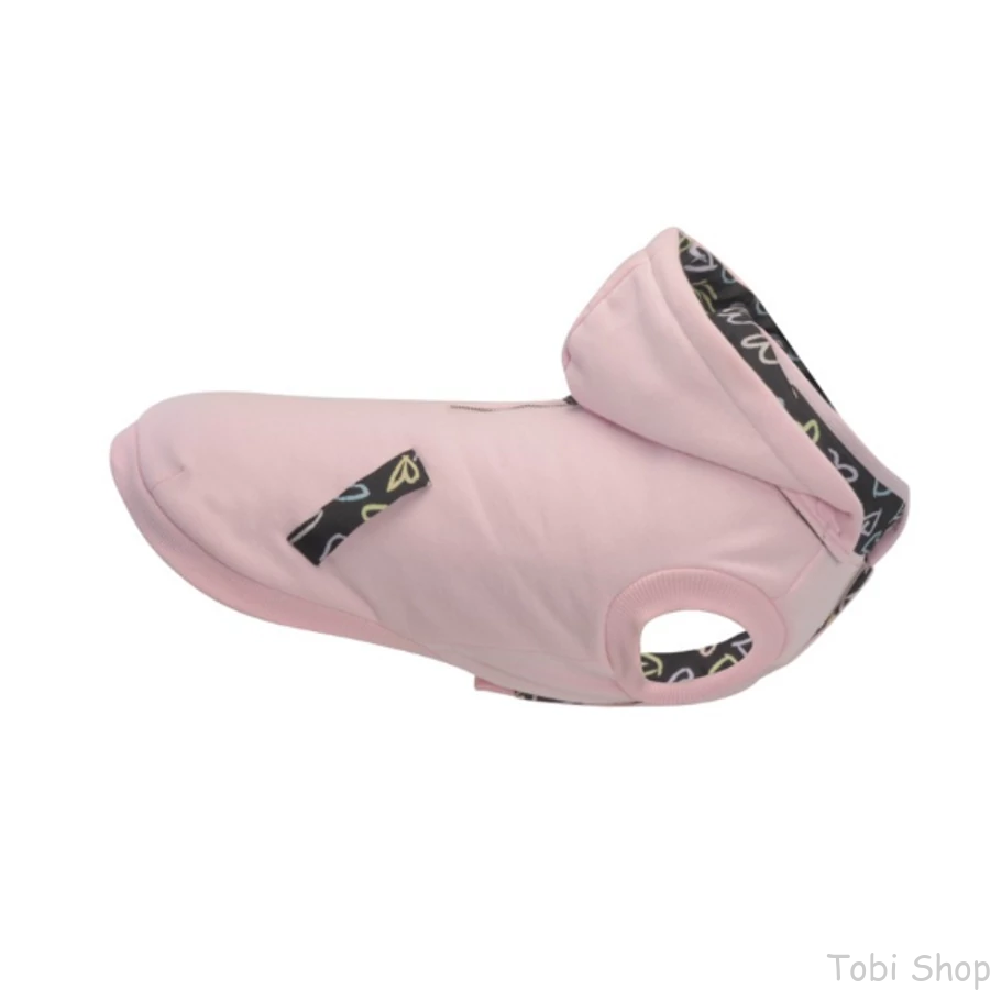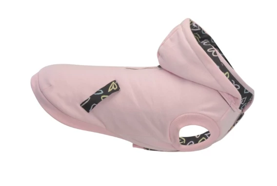 Kifordítható pulóver kapucnival.Oldalsó zseb és a díszítő zsebfedő harmonizálnak a belső mintával. A hasán dupla tépőzáras rögzítés van. Kivágások a nyakörv és a hám számára, valamint gumírozott pántok a hátsó lábaknál.