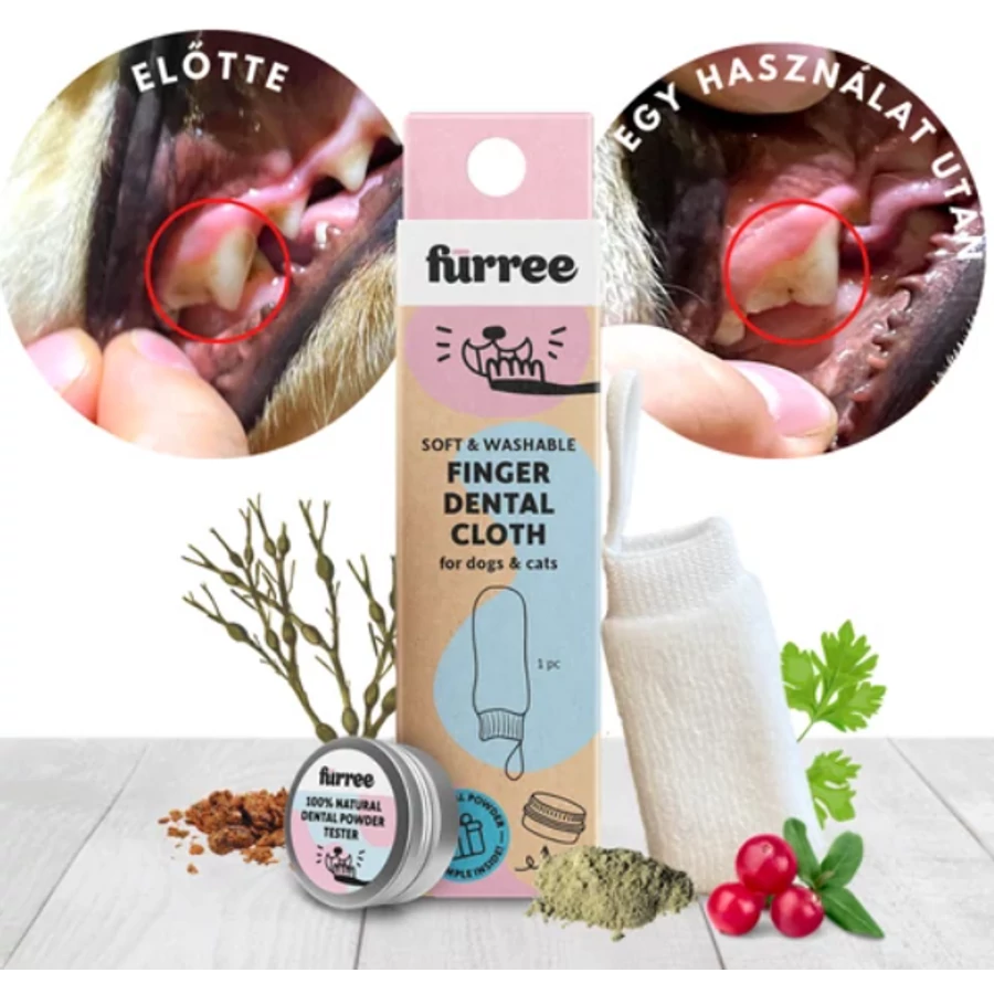 A csomag tartalma: 1 db Fürree ujjra húzható fogtisztító kendő + 1 db Fürree fogápoló por minta