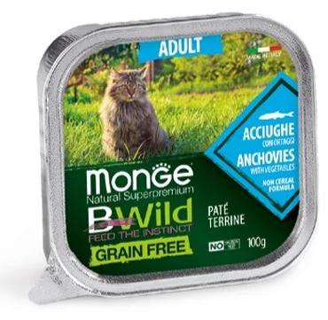 Monge Natural Super Premium Bwild Grain Free Formula Adult Cat szardella zöldségekkel zöldbabbal és sárgarépával 100 g