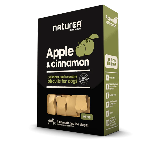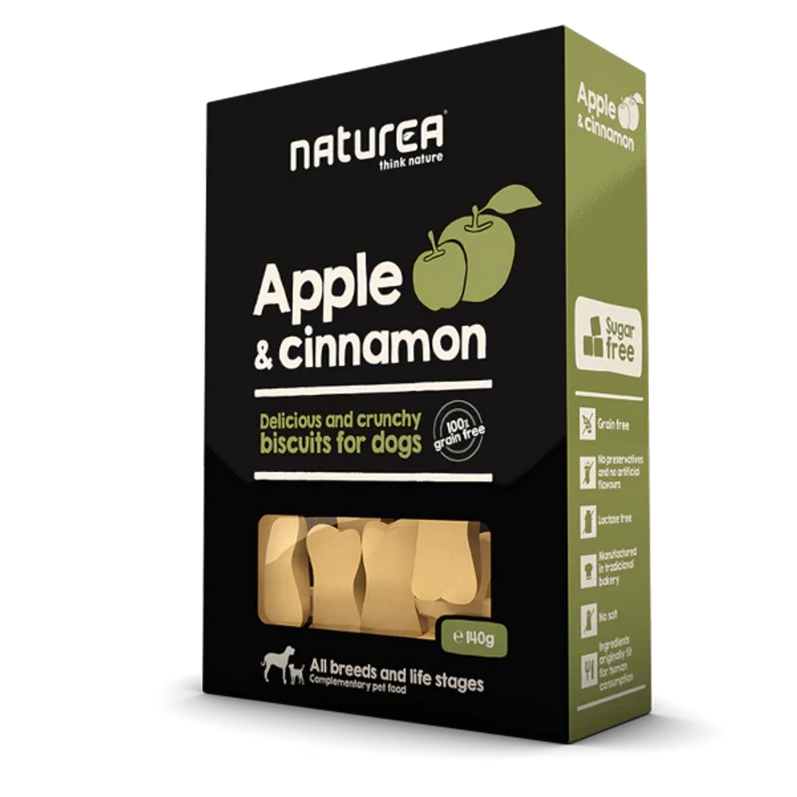 A Naturea házi készítésű kekszek egy kis Portugál tengerparti városban, hagyományos receptúra alapján készülnek gondosan válogatott, friss és egészséges összetevőkből. A friss alma egy csipetnyi fahéjjal ízesítve olyan ízkombinációt eredményez, amitől mindenkinek összefut a szájában a nyál, lehet akár két vagy négylábú.
