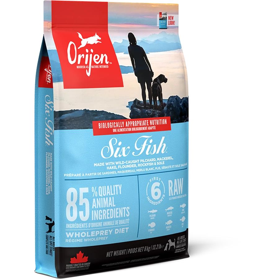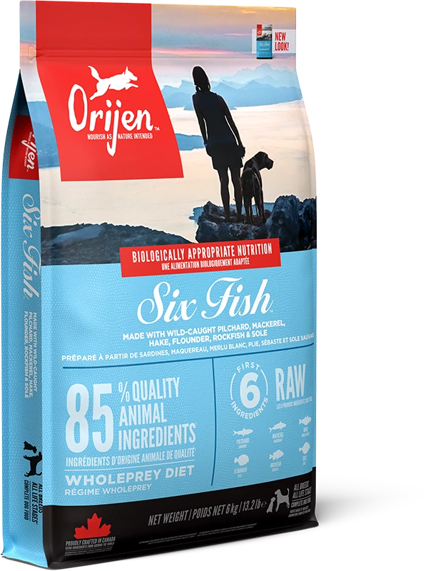 Egy fehérjében bőséges és mérsékelt szénhidráttartalmú étrend garantálja a kutya kiváló testi és lelki kondícióját. Az ORIJEN® 6 Fish tápanyag-összetétele tökéletesen megfelel egy ragadozó szükségleteinek: a bőséges fehérje kizárólag tengeri forrásból származik, az olajok és zsírok jelentős mennyiségben tartalmaznak DHS és EPS Omega 3 zsírsavakat, a kondroitin és glükózamin pedig az egészben megfőzött halakból származik. A 85 %2 halból készült ORIJEN 6 Fish egyértelműen a kategória csúcsa, halimádó és szőrzetükre igényes kutyáknak kifejezetten ajánlott.