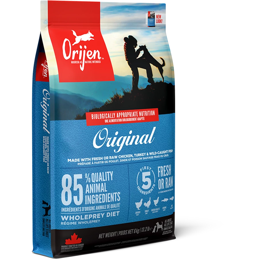 Hasonlóan a vadon élő őshöz, a szürke farkashoz, bármely fajta kutyának változatos húsokban bőséges táplálék a biológiai szükséglete. Az ORIJEN® Original alapanyagainak 85 %-a1 állati eredetű: szabadon tartott2 csirke és pulyka, vadon fogott vagy fenntarthatóan tenyésztett halak és tojás. A vadon élő kutyafélék szinte az egész prédát elfogyasztották, ezért a húsok mellett belsőségeket és porcokat is megfőzünk, a halak jelentős részét pedig egészben használjuk fel. Az eredmény egy olyan Biologically Appropriate étrend, ami tökéletesen illeszkedik a házi ragadozód tápanyag-szükségleteihez.