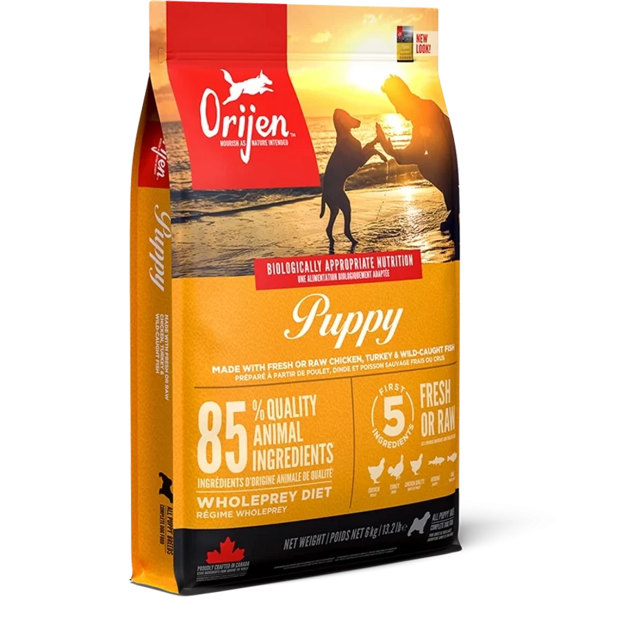 A gyors tempóban növekedő kölyöknek fehérjékben és zsírokban gazdag, Biologically Appropriate étrendre van szüksége. Az ORIJEN® Puppy 85 %1 különféle, minőségi állati alapanyagokból készül a WholePrey arányainak megfelelően: szabadon tartott2 csirke és pulyka, vadon fogott vagy fenntarthatóan tenyésztett halak, egész tojás és tápanyagdús belsőségek. Az összetevők jelentős része FRISSEN vagy NYERSEN3 érkezik a konyhánkba, az alacsony feldolgozottsági szint miatt a fehérjék és zsírok kevésbé sérülnek: az eredmény egy tápanyagdús és ízletes, ragadozóknak összeállított eledel, a cuki kölyök imádni fogja.