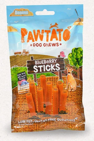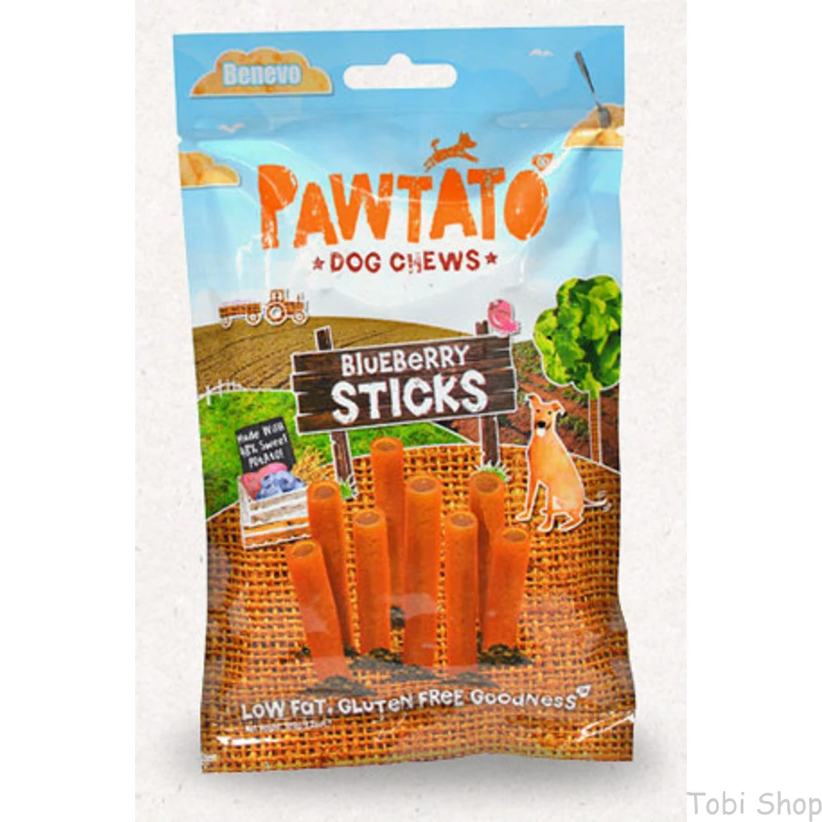 Édesburgonya- és rizs pálcikák kék áfonyás töltelékkel. Alacsony zsírtartalmú, gluténmentes, hipoallergén rágcsálnivaló, mely adható jutalomfalatként vagy snack-ként. A Pawtato növényi pálcikák egészséges és természetes alternatíváját jelentik a marhabőr rágókáknak. A fitonutriensekben gazdag édesburgonya természetes módon tartalmaz rengeteg vitamint és ásványi anyagot, valamint rostot, ami jótékonyan hat a kutyák emésztőrendszerére.