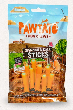 Édesburgonya- és rizs pálcikák spenótos-fodros keles töltelékkel. Alacsony zsírtartalmú, gluténmentes, hipoallergén rágcsálnivaló, mely adható jutalomfalatként vagy snack-ként. A Pawtato növényi pálcikák egészséges és természetes alternatíváját jelentik a marhabőr rágókáknak. A fitonutriensekben gazdag édesburgonya természetes módon tartalmaz rengeteg vitamint és ásványi anyagot, valamint rostot, ami jótékonyan hat a kutyák emésztőrendszerére.