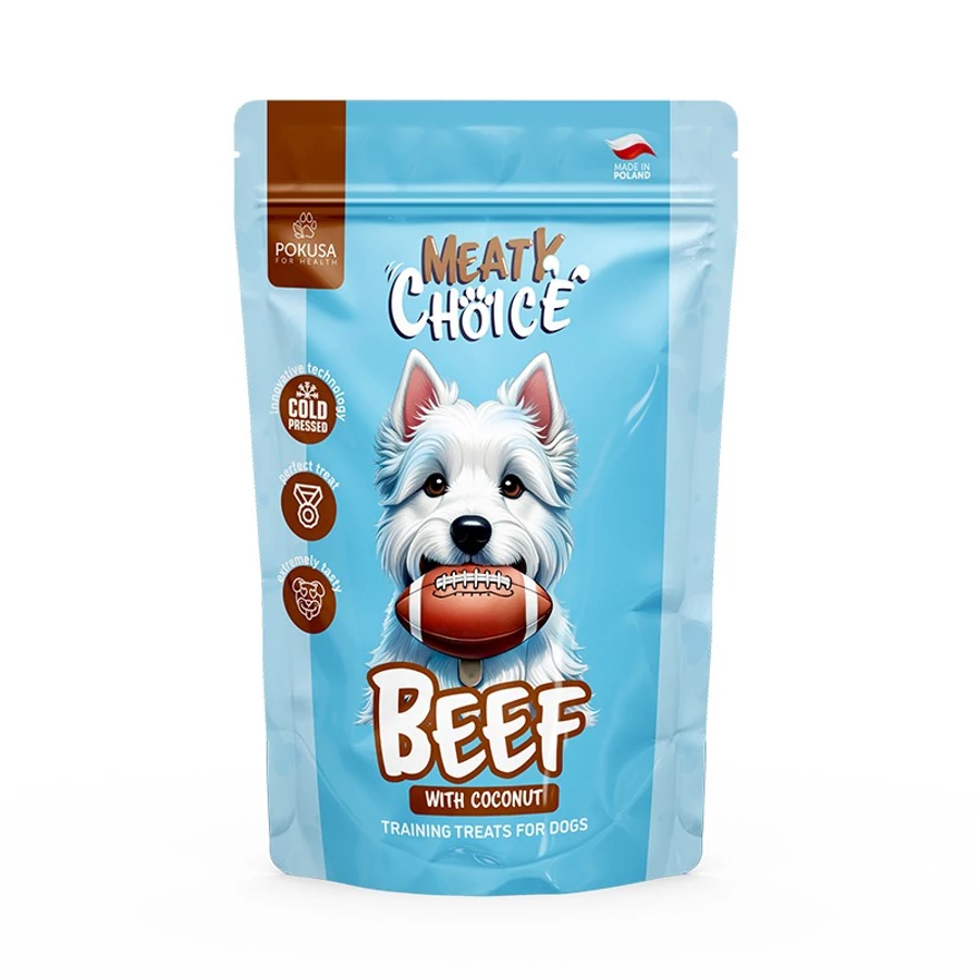 A Meaty Choice – Marhahús + kókuszos jutalomfalatok, természetes, könnyen emészthető tréningfalatkák, olyan kutyák számára, akiknek extra energiára van szükségük a tréning vagy a mindennapi élet során. A hidegen sajtolási eljárás megőrzi a természetes ízeket és tápanyagokat. Az aromás marhahús és a kókuszdió kombinációja kiváló minőségű fehérjét , zsírokat (beleértve az MCT-ket is) és értékes ásványi anyagokat biztosít . Az MCT zsírsavak könnyen hasznosítható energiaforrásként szolgálhatnak – ideálisak a kontrollált, kalóriatudatos jutalmazáshoz és az aktív időszakokban.