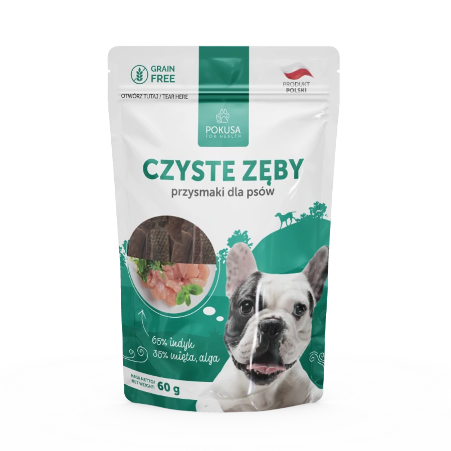 POKUSA NATURAL SNACKS - CLEAN TEETH húscsíkok pulykahússal, mentával és algával 60 g