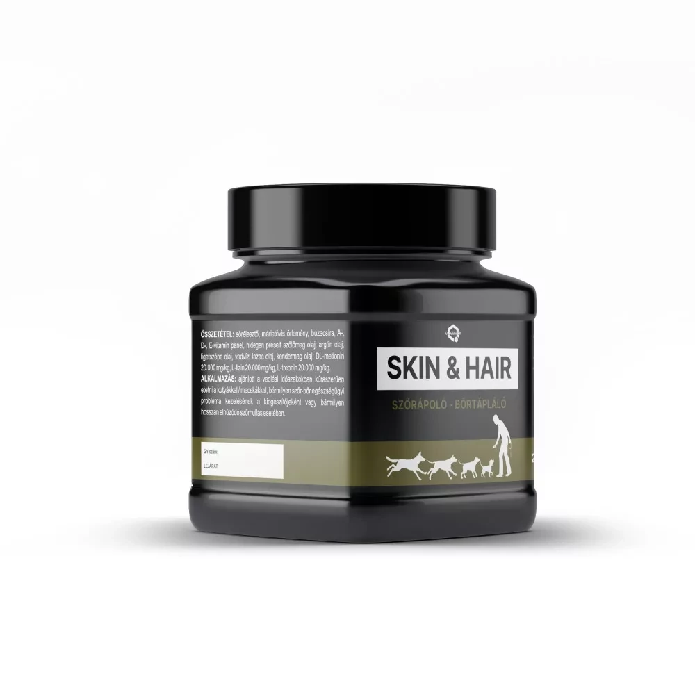 Összetett szőr ápoló és bőr tápláló készítmény, minden korú kutyáknak. Bizonyítottan hatásos gyógynövények, természetes B vitaminok és hidegen préselt olajok egyedi kombinációja, látványosan javítja a kutyád szőr és bőr állagát, kinézetét.