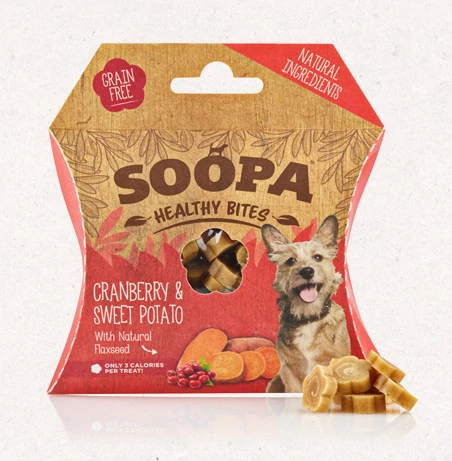 A Soopa vegán jutalomfalatok telis-tele vannak vitaminnal és ásványi anyagokkal, hipoallergének, mivel csak növényi összetevőket tartalmaznak, mégis gabonamentes receptúra alapján készülnek. Ezek a kis falatnyi jutik tökéletesen használhatóak tréningezésre. Zseb-barát kis zacskóba vannak csomagolva, így könnyű magaddal vinni.