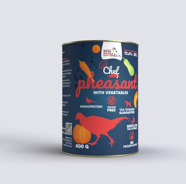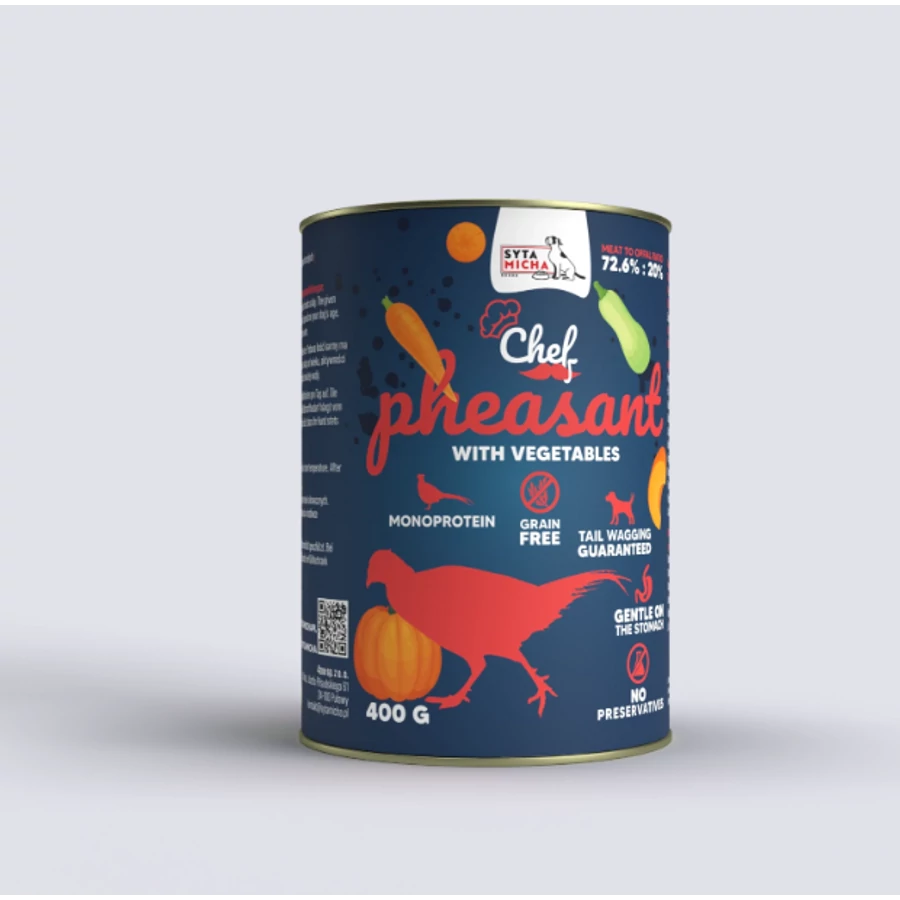 A Syta Micha Chef fácán zöldségekkel egy teljes értékű, monoprotein nedves eledel felnőtt kutyák számára, melyet kutyatáplálkozási szakértők fejlesztettek ki. A recept 92,6%-ban állati eredetű összetevőkből áll, ebből 72,6% izomhús.
