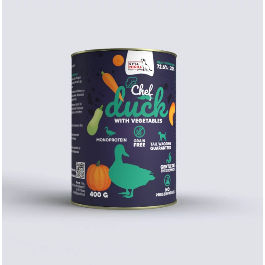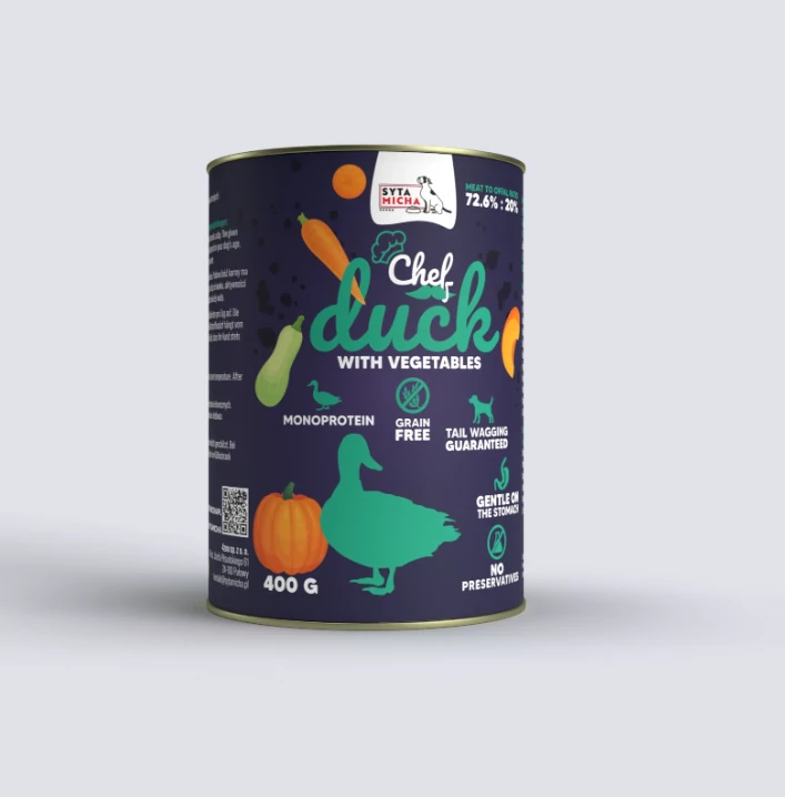 A Syta Micha Chef kacsa zöldségekkel egy teljes értékű, monoprotein nedves eledel felnőtt kutyák számára. A recept 92,6%-ban állati eredetű összetevőkből áll, ebből 72,6% izomhús.