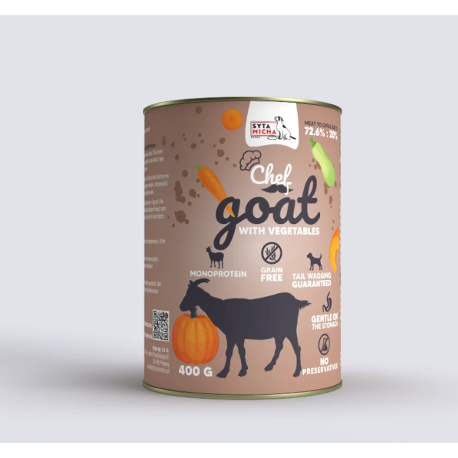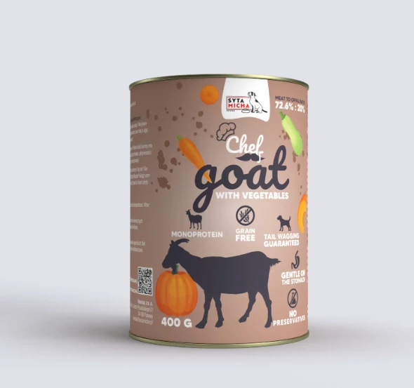 A Syta Micha Chef kecske zöldségekkel egy teljes értékű, monoprotein nedves eledel felnőtt kutyák számára. A recept 92,6%-ban állati eredetű összetevőkből áll, melyből 72,6% izomhús.