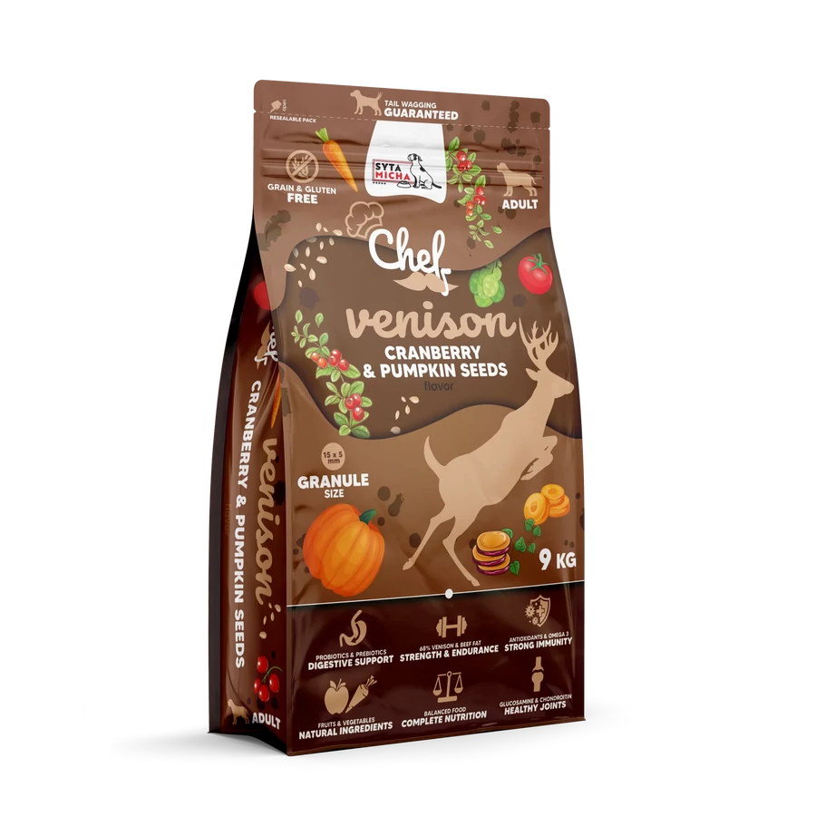 A Syta Micha szarvashús, áfonya és tökmag egy gabona nélküli és teljes értékű formula minden felnőtt kutya számára. Ez egy megfelelően kiegyensúlyozott étel, amelyben első helyen áll a 60% szarvashús, ami kiváló fehérjeforrás, amely elengedhetetlen az izomtömeg és az ideális testsúly fenntartásához.
