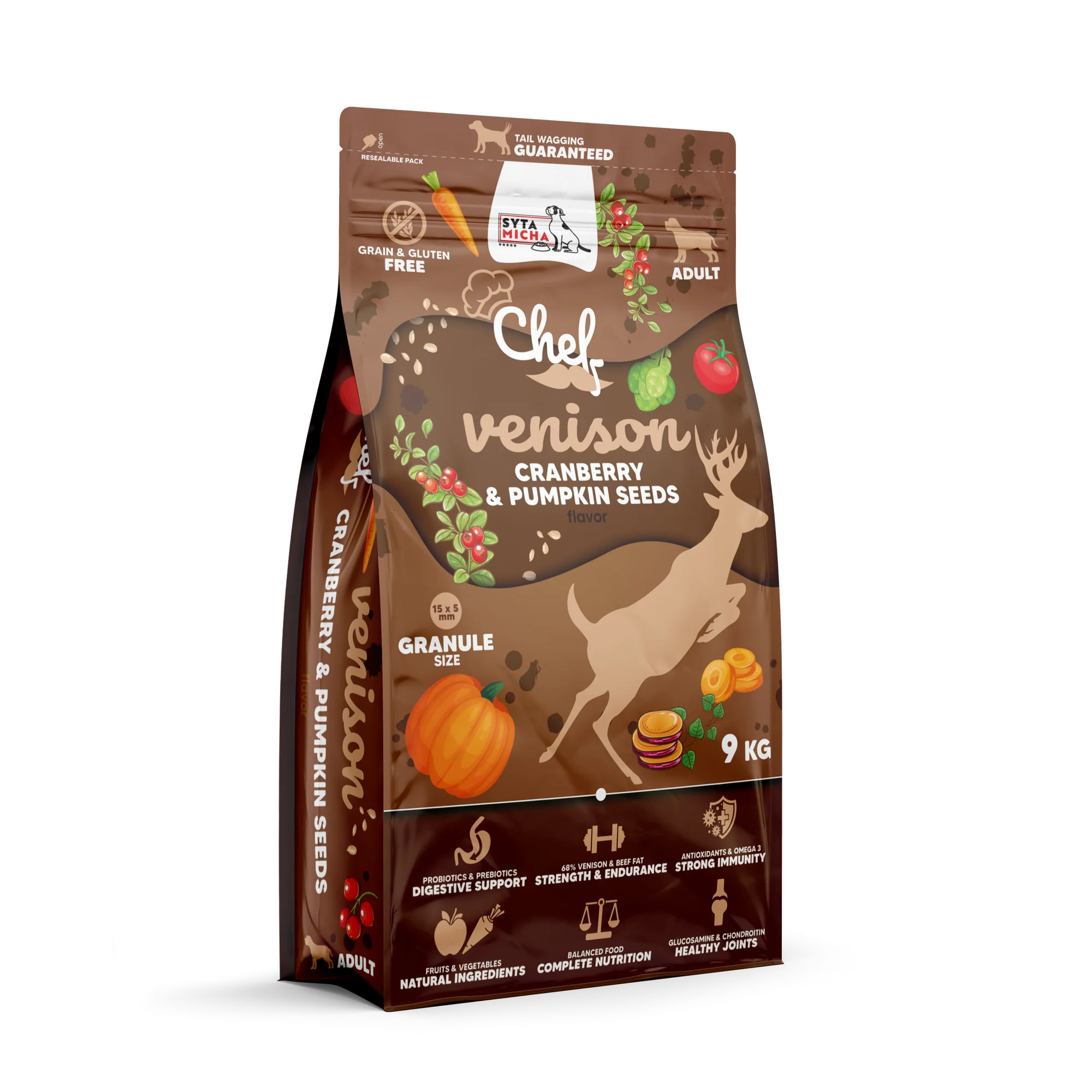 A Syta Micha szarvashús, áfonya és tökmag száraz kutyatáp felnőtt kutyáknak egy teljes értékű étrend, amely nemcsak kielégíti a kutya étvágyát, hanem elsősorban a legmagasabb szinten gondoskodik egészségéről.