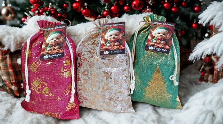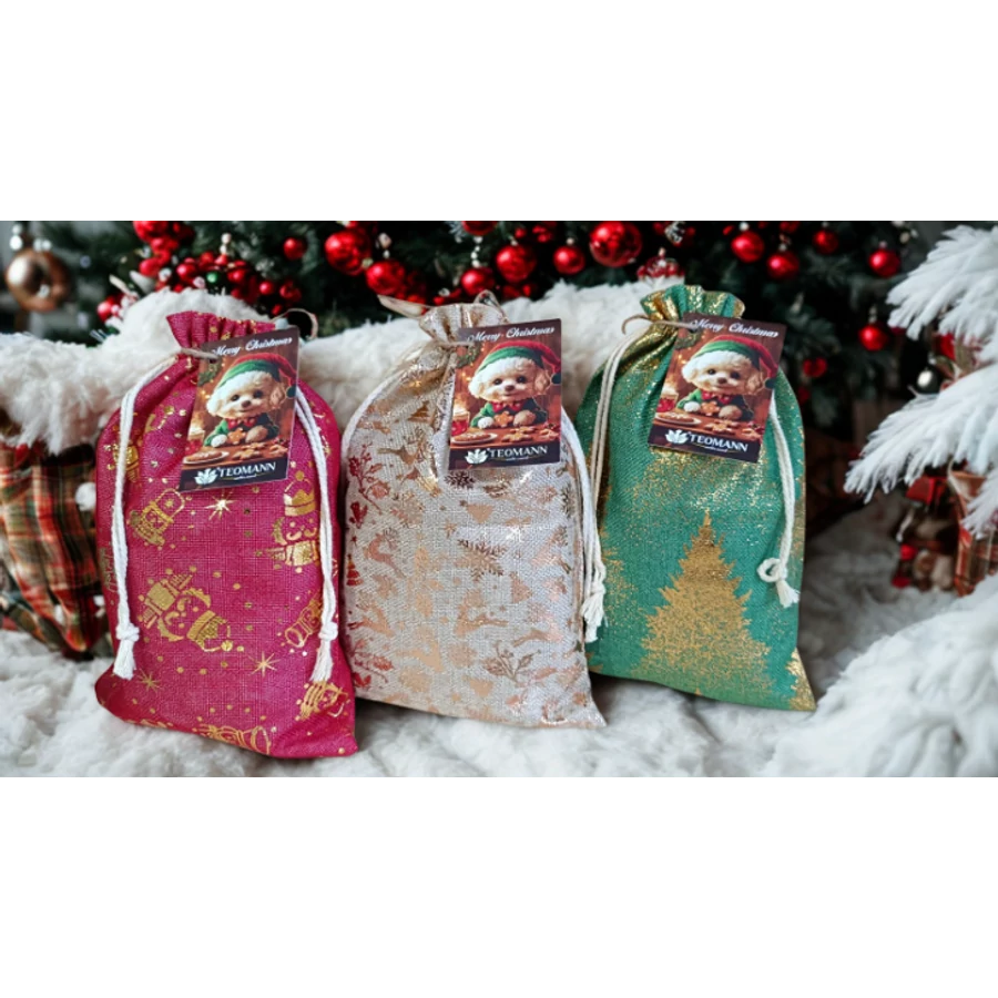 Színes, karácsonyi csillogós zsákokban szárított jutalomfalatok, 100%-ig természetes falatok, különböző ízkombinációkban.